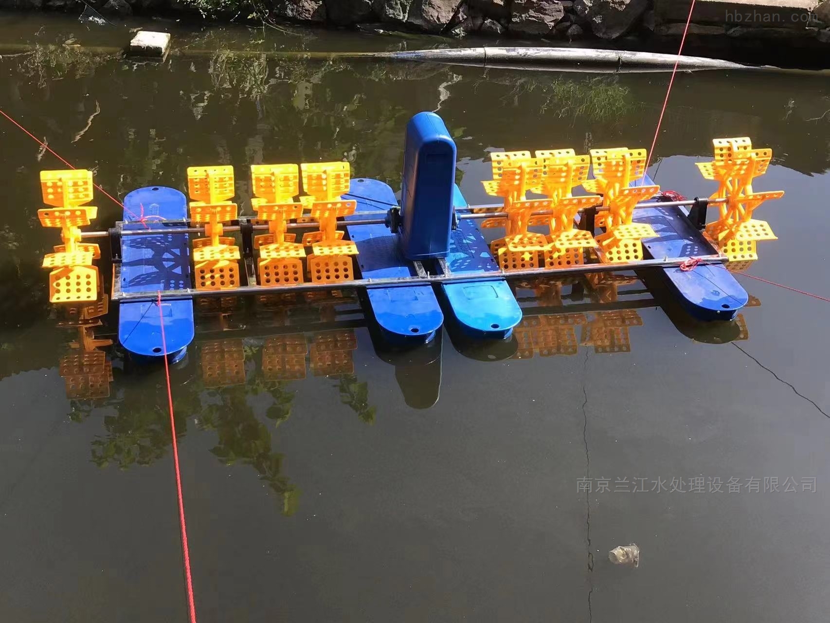 水车增氧机六叶轮3kw主要由水冷电动机、一级传动大齿轮或减速箱、机架、浮船、叶轮等五个部分组成。工作时,以电动机为动力,通过一级传动大齿轮,驱动叶轮转动,叶轮叶片部分或全部浸没于水中,旋转过程中,叶片高速击打水面,激起水花,将大量空气进一步溶解,形成溶解氧,那氧气带入水中,同时产生强劲的作用力,一方面把表层水压入池底,另一方面将水推动,使水流动起来,将溶氧迅速扩散,采用潜水电机设计理念,不会因电机翻入养殖塘而损坏电机,造成高额维修费。电机使用高速电机:提高水花及转动速度,可瞬间提高溶解氧。采用一级传动大齿轮避免因漏油使水体受污染。整机使用塑料浮船,尼龙叶轮,不锈钢转轴和支架。结构简单、便拆、成本低,用户可以根据使用水域选择3轮、4轮、5轮、6轮,降低耗电量。